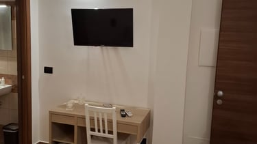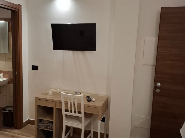 Una camera moderna e ben arredata, dotata di bagno privato e televisione. Ideale per chi cerca un ambiente rilassante e curato nei dettagli